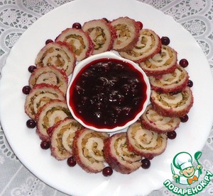 Рулетики охладить и нарезать на кусочки. Подавать с брусничным соусом.
