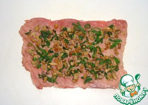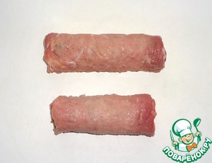 Мякоть свинины нарезать тонкими пластинами, отбить и посолить с обеих сторон. Мясо нарезать легче, когда оно немного заморожено.