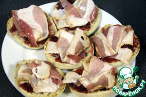 Затем положить сверху каждой булочки по кусочку ветчины.