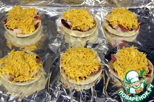 И потом сырную смесь. Булки запекать в духовке, нагретой до 350F (170С), примерно 10 минут или пока сыр не расплавится.