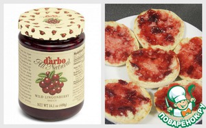 Булки разрезать пополам и немного поджарить в тостере. Затем каждую половинку смазать брусничным соусом.