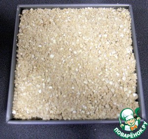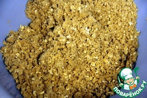 В отдельной посуде смешать муку, коричневый сахар, овсяные хлопья, корицу и масло. Получается смесь в виде крошки.