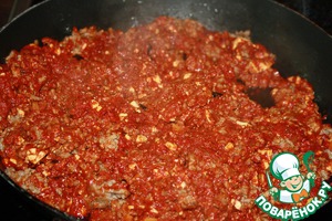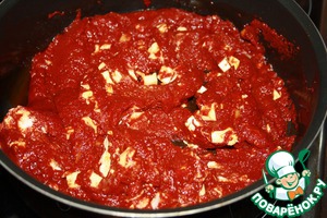 Выложить томатную пасту. Если паста очень густая, долить немного воды (паста не должна стать слишком жидкой, так что с водой главное не переборщить!)