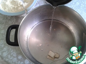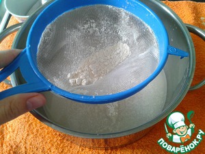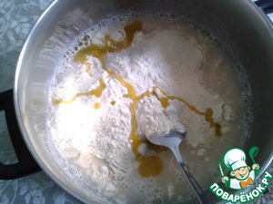 • В полученную жидкость, не дожидаясь ее остывания, просеять 140 г белой пшеничной муки.
