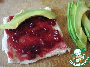 Берем подготовленные тосты, смазываем брусничным соусом, кладем дольку авокадо.