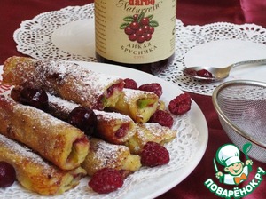 Готовые обжаренные рулетики посыпать сахарной пудрой и украсить ягодами, например, малиной, как у меня.