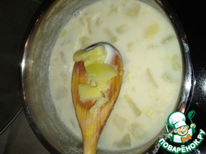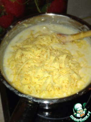 Далее все нужно проварить пару минут, чтобы не было вкуса муки, и добавить сыр, но грамм 50 сыра нужно оставить, чтобы в дальнейшем засыпать запеканку перед запеканием.