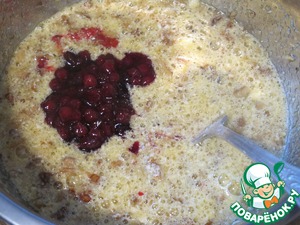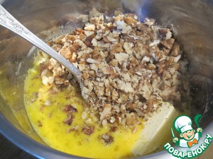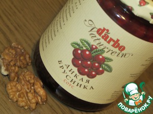 Яйца слегка взболтать и смешать с сахаром, ванильным сахаром, маслом, брусничным соусом и рубленными грецкими орехами.