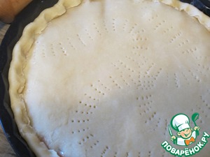 Поместить в холодильник на 15-30 минут. Тесто раскатать очень тонко, выстелить дно формы (26 см в диаметре) и один пласт теста оставить, чтобы накрыть пирог сверху.