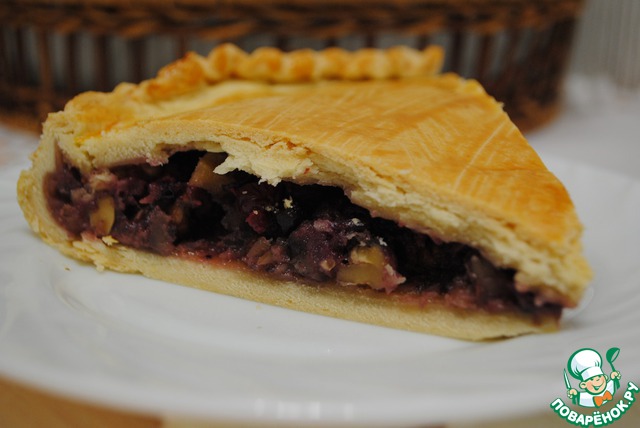 Этот рецепт пирога я нашла в книге "Мировая Кухня". Рецепт с моими личными изменениями и добавлениями. Пирог получился восхитительный. Особенно хорошо раскрывается вкус начинки, когда на зубок попадает ягодка брусники. Сразу вкус оживляется, становится ярким, пленяющим. Так и хочется еще кусочек.