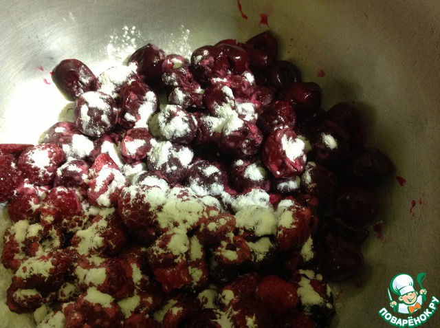 Малину и вишню разморозили, отцедили, добавили 2 ст. л. крахмала, аккуратно перемешали
