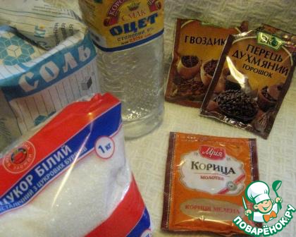 Приготовить маринад: сахар, соль, уксус, перец душистый, гвоздика и корица. Довести до кипения.