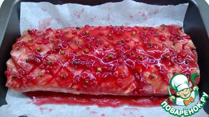Готовое мясо выложить на блюдо. Украсить по желанию. К блюду подать брусничный соус.