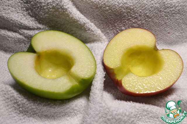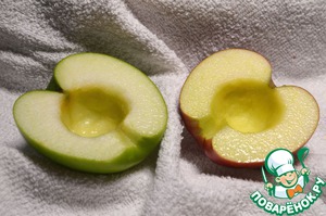 Каждое яблоко разрезаем пополам и чайной ложкой делаем углубления в каждой половинке, удаляем семена. Лимонным соком я обработала срезы, это дает немного вкуса и не дает потемнеть мякоти.