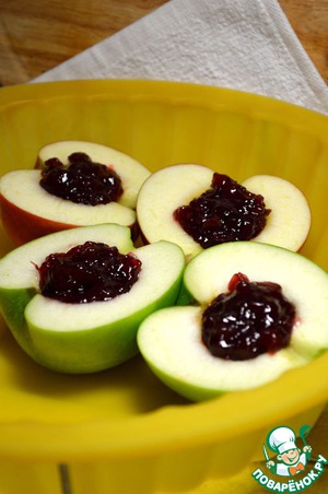 Наполним яблочки начинкой. У меня вышло по 20г на каждую половинку яблока, это полная чайная ложка с горкой