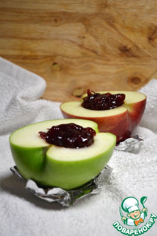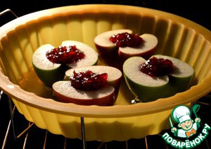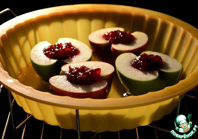 Ставим яблоки в духовку, уменьшаем температуру до 200-220град. Томим около 20 минут, до тех пор, пока на мякоти яблок не появится пенка