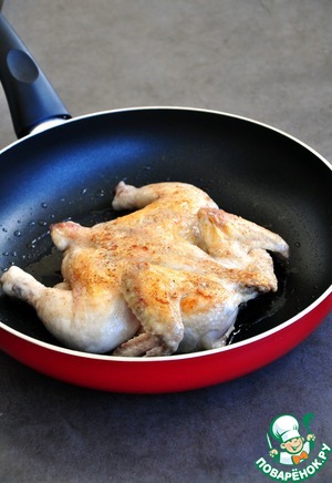 Обжаривать на оливковом масле в тефлоновой сковороде минут по 10 с каждой стороны. Если вес цыпленка больше, тогда готовить минут 10 с каждой стороны и довести до готовности в духовке 15 минут при 180* в режиме полуконвекции.