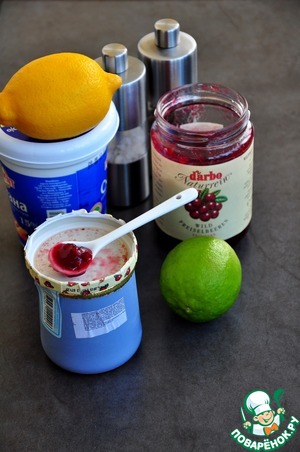 Для приготовления соуса нужно смешать сметану, йогурт и лимонный сок, добавить брусничный соус "D'arbo", добавить соль и перец по вкусу.
