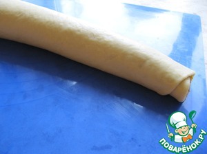 По короткой стороне скатала рулет, важно это сделать как можно плотнее! Аналогичные манипуляции проделала со вторым куском. (Так как за один раз не удается раскатать тесто тонко, не хватает коврика!)
