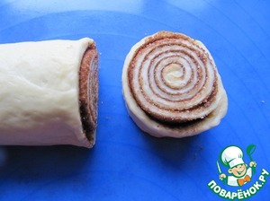 Нарезать рулет острым ножом на кусочки высотой 4-5 см. При выкладывании булочек краешек теста подворачивала под низ.