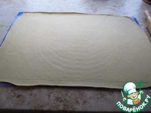 У меня рабочий силиконовый коврик размером 30Х60, тесто мысленно разделила на 3 части, сформировала шар из 2/3 и 1/3 части теста. Коврик мукой не подпыляла, раскатывала до толщины теста на пельмени. Смазать тесто кисточкой мягким сливочным маслом тонким слоем.