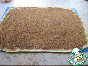 Смешала коричневый мелкий сахар с корицей. (Пробовала и белый сахар, но при выпекании он начал течь сильнее, чем коричневый!). 2/3 сахара равномерно высыпала на раскатанное тесто.