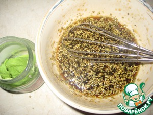В соевый соус добавляем оливковое масло, мед, травки и горчицу (у меня васаби).