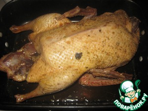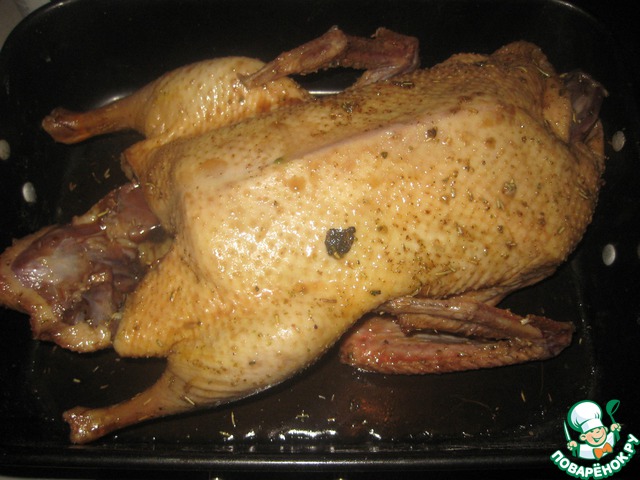 Намазываем нашу уточку снаружи и изнутри, оставляем мариноваться часа на два. Через два часа накалываем кожу утки ножом и ставим в разогретую до 180 град. духовку запекаться на 20 мин. грудкой вверх.