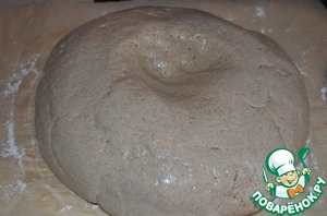 В центре - по желанию - сделайте углубление (диаметром в 6 см). Проткните поверхность заготовки вилкой и посыпьте ржаной мукой (либо отрубями). Оставьте подходить часа на 1,5, до увеличения в объеме примерно в 1,5 раза. Поверхность хлебушка начнет покрываться трещинками