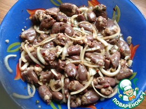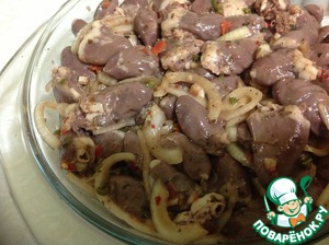 Сердечки промыть, отжать от лишней влаги и замариновать на час. Смешать все ингредиенты для маринада, лук порезать тонкими полукольцами, чеснок мелко порубить и выложить сердечки, убрать в холодильник и время от времени их перемешивать в маринаде.
