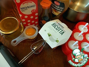 Ингредиенты для «Мороженое молочное с рикоттой, арбузным вареньем и соевым соусом и эскимо из него»: