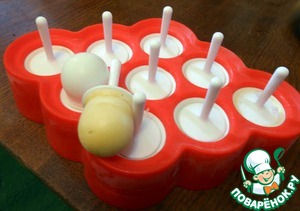 Так шарик выглядит после заморозки. Вынимается очень легко (донышки у формы из мягкого силикона, они легко выворачиваются наружу, когда тянешь эскимо за палочку).