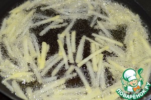 В большом количестве подсолнечного масла обжариваем картофель до румяной корочки. Рекомендую жарить порциями, чтобы картофель не слипался