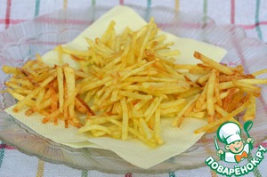 Часть картофеля, который я запланировала добавлять в сам салат, не стала сильно зажаривать, чтобы он был помягче, а часть сделала более румяным, так он лучше будет смотреться на блюде на этапе украшения. Выкладываете готовый картофель на салфеточки, чтобы ушло лишнее масло. Тут же можно присолить сразу.