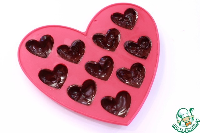 • Остатки шоколада успели уже застыть. Снова нагрейте их до 45 градусов, поставьте посуду с шоколадом в холодную воду, охладите вновь шоколад до 30 градусов, перелейте в кондитерский мешок и заполните каждую ячейку расплавленным шоколадом.