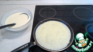 Жарим блины. Тесто наливать тонкой струйкой в середину горячей сковороды. Блины должны быть тонкими.