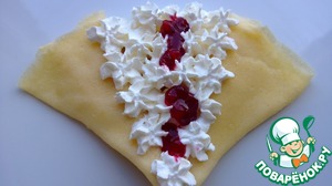 Выложить блинчик на блюдо и украсить взбитыми сливками. По центру выложить Брусничный соус.