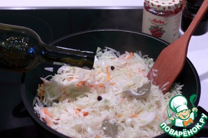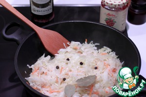 Добавить квашеную капусту, положить ягоды можжевельника и лавровый лист, закрыть крышкой и потушить на слабом огне пару минут.