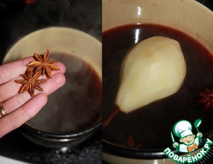 В неглубокую кастрюлю влить шипучее полусладкое вино (в идеале ламбруско), распотрошить туда же стручок ванили, разрезав его сначала пополам, а потом ножом соскоблив в кастрюлю семечки. Стручок тоже можете бросить в кастрюлю. Всыпьте сахар, бросьте корицу и бадьян и, дождавшись, когда вино закипит, бросьте туда груши. Вино на время успокоится, а потом примется кипеть с новой силой, и тогда нужно убавить огонь до минимума, чтобы содержимое кастрюли чуть побулькивало. В таком состоянии надо оставить кастрюлю на час пятьдесят. После чего извлечь груши шумовкой и отложить охлаждаться.