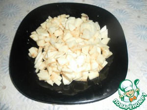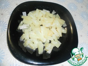Ананасы освобождаем от жидкости. Если это готовые кусочки, можно их не резать мельче. Если же у вас шайбы - порезать на кусочки.