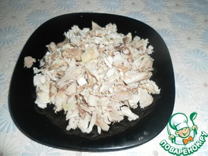 Курицу отвариваем, режем кусочками (я люблю в этот салат все резать покрупней, потом выглядит красивее).