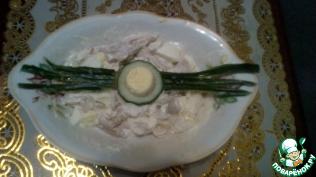 Украшаем, следуя своей фантазии (я украсила, следуя шепоту своих домашних:\\"Бы-ыстре -е-е!\\", т. е. торжественно водрузила поверх салатика веточку петрушки и все: через 5 минут на тарелке только эта веточка и осталась).