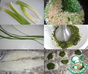 Каждый кусочек связать тонкой полоской порея, обжарить с двух сторон на растительном масле.