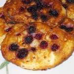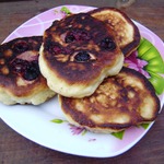 После того, как положили наши оладушки, сразу сверху на каждый положить по 1ст. ложке отцеженных ягод брусники, разровнять их по поверхности. Когда низ поджарится, перевернуть.