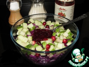 Рецепт «Салат из краснокочанной капустыс яблоками и клюквенным соусом»: