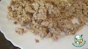 Охладить, перемолоть на мясорубке с жареным луком. Добавить пару столовых ложек бульончика, если фарш будет суховат.