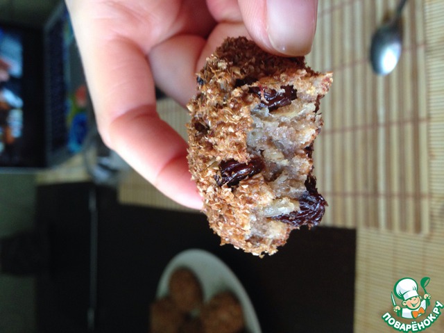 2. Вымешайте смесь руками, все ингредиенты должны хорошо соединиться друг с другом. Сформируйте 12 шариков и обваляйте их в овсяных хлопьях. Слегка расплющите печенье.