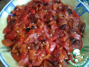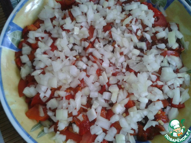 Очистить перец от кожицы, нарезать мелко и положить сверху помидоров.
