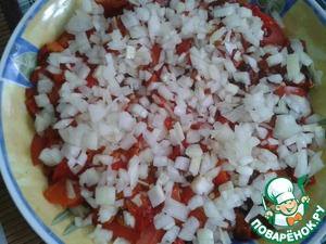 Помидор вместе с кожицей нарезать секторами, немного посолить - второй слой.