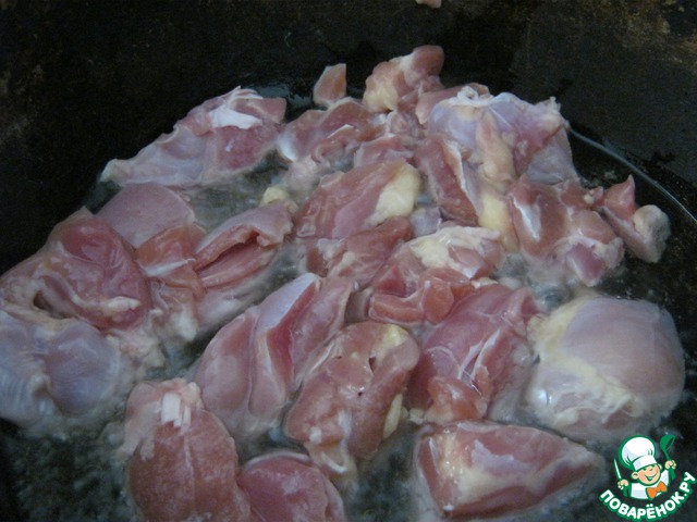 Берём тушку курицы и разбираем её. Освобождаем от костей и кожицы. Сейчас можно купить в магазинах уже готовое филе, голени и прочее. Но так как я готовлю по рецепту своей бабушки, я строго придерживаюсь рецепта. Раньше из оставшегося рагу она готовила бульоны, а на его остове уже супы, ну это уже другая история. Вы можете просто порезать тушку курицы на крупные куски. Мясо немного обжариваем в растительном масле.